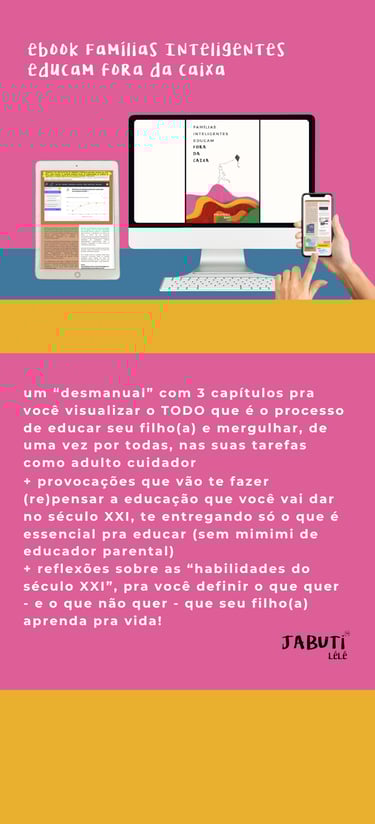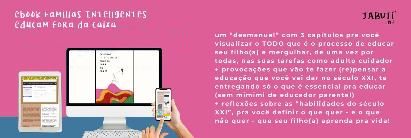 Foi pra te dar uma forcinha com esses mergulhos mais profundos, que a Jabuti fez o ebook “Famílias Inteligentes Educam fora da Caixa: um desmanual para repensar o essencial da educação de casa e aplicar a ciência do desenvolvimento aos primeiros anos de vida”.